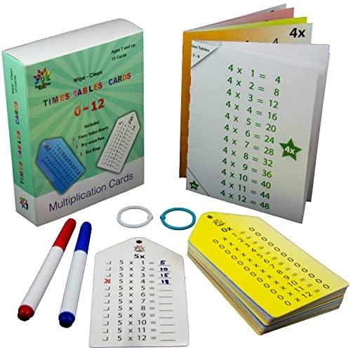 Wipe-clean portable 0-12 times tables cards with key rings (1 extra) and self-test on the back, dry erase markers (1 extra), and bonus multiplication fact charts. Ideal times tables facts learning supplies for home or travel. A must-have for classrooms and for homeschool supplies.
