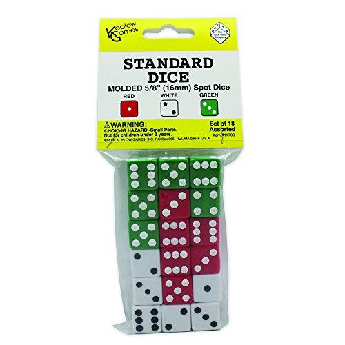 Everyday classroom dice. Six each of red, white, and green 5/8" molded dot dice. Hundreds of counting, sorting and math applications. Set of 18.