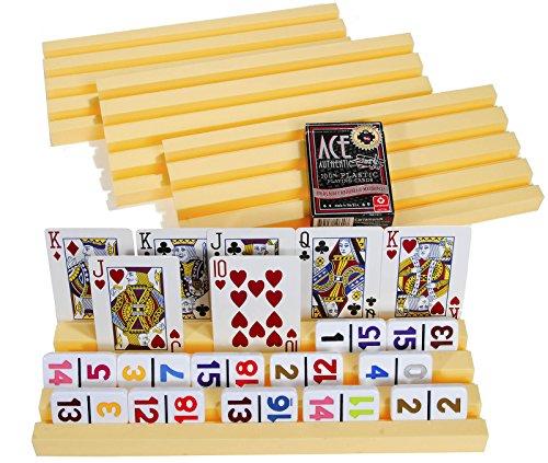 Make your dominoes or card game that much easier with Dual-Use Plastic Trays. Unique channel design allows placement of either playing Cards or Dominoes in the trays. Channels are 1/2 inch thick and will accommodate both professional, jumbo and tournament size dominoes. Dominoes are placed on their side in these racks (NOT upright.) Wide 5 x 12 inch base makes these exceptionally stable on a table (as opposed to thinner racks similar to those used in Scrabble). This is a set of 4 (four) plastic Dominoe or Playing Card Trays. Includes 1 (one) deck of Deluxe ACE 100% plastic playing cards included. (these shipped in RANDOM color backings; either Red or Blue.). Feel, deal, fan, and shuffle superbly. Durable, long-lasting playing cards. Easy to clean. Great for outdoor use; impervious to dampness. Standard size (3.5 x 2.5 inches) playing cards. Sometimes referred to as Poker Size as opposed to bridge width. Dominoes included. Shown in photos for illustrative purposes only. Returns, if necessary, are always processed promptly. Return of the entire new bundle required for any refund to be issued. Recommended for ages 14 to adult.