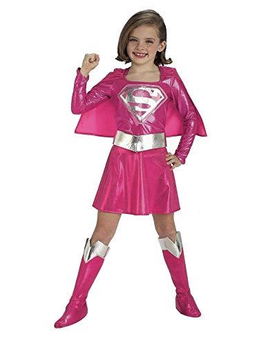 - This childs pink Supergirl costume includes dress with attached cape, belt and boot tops.